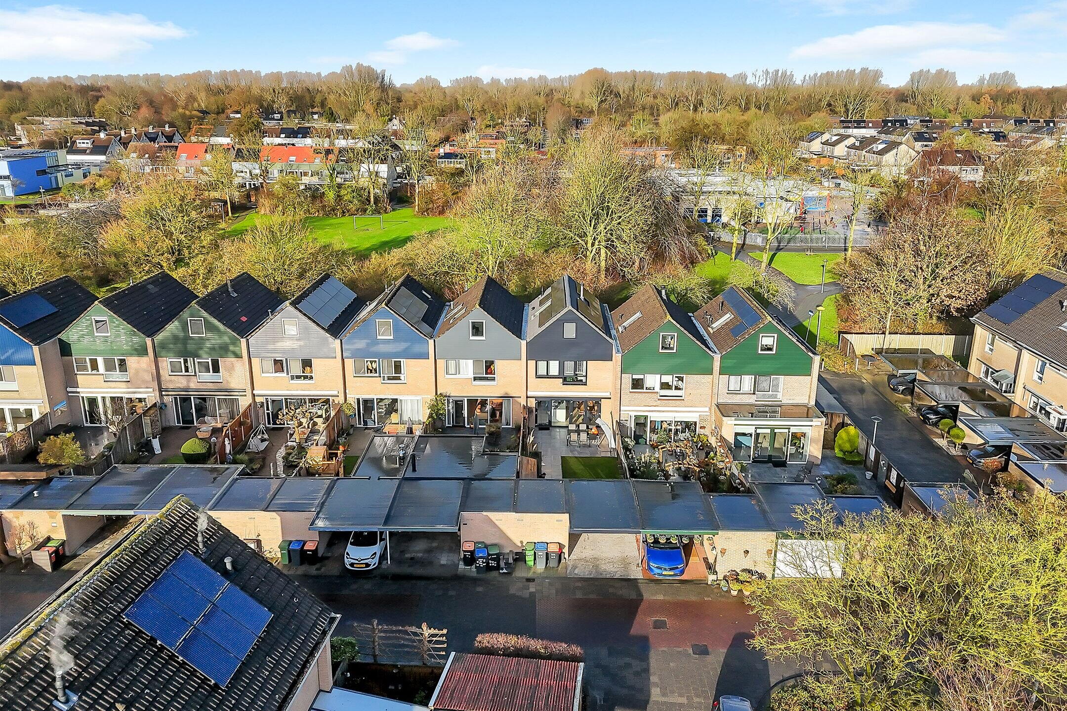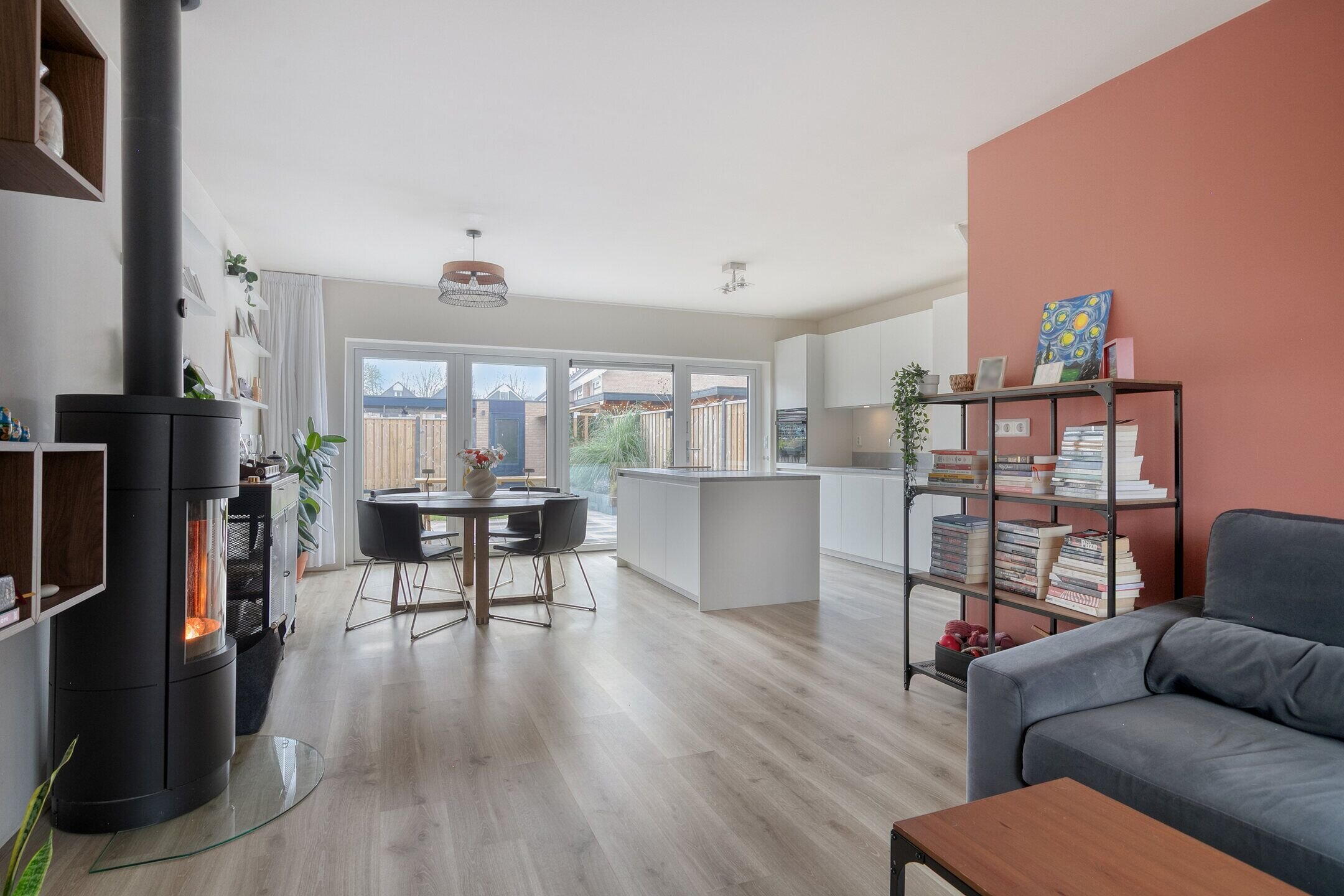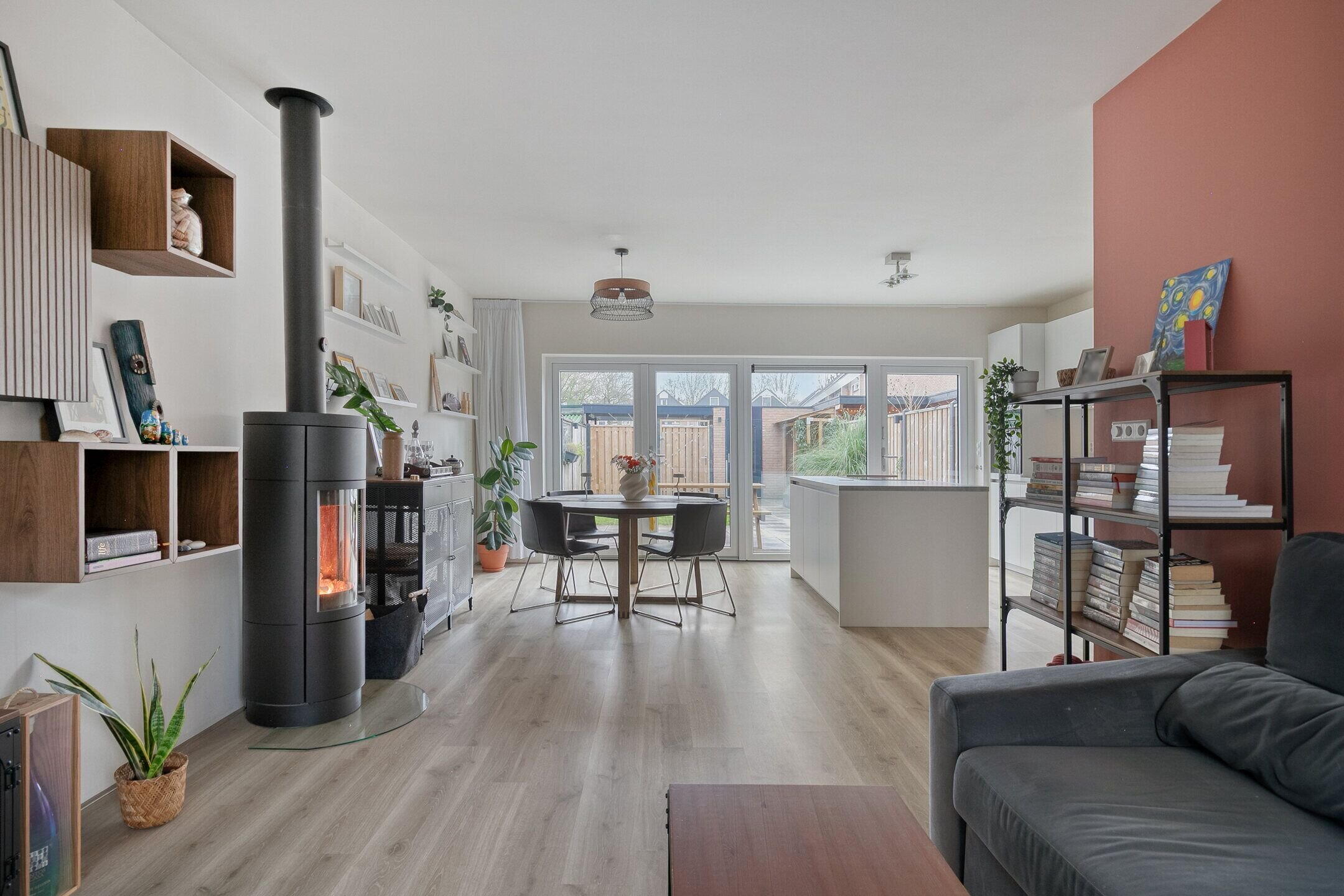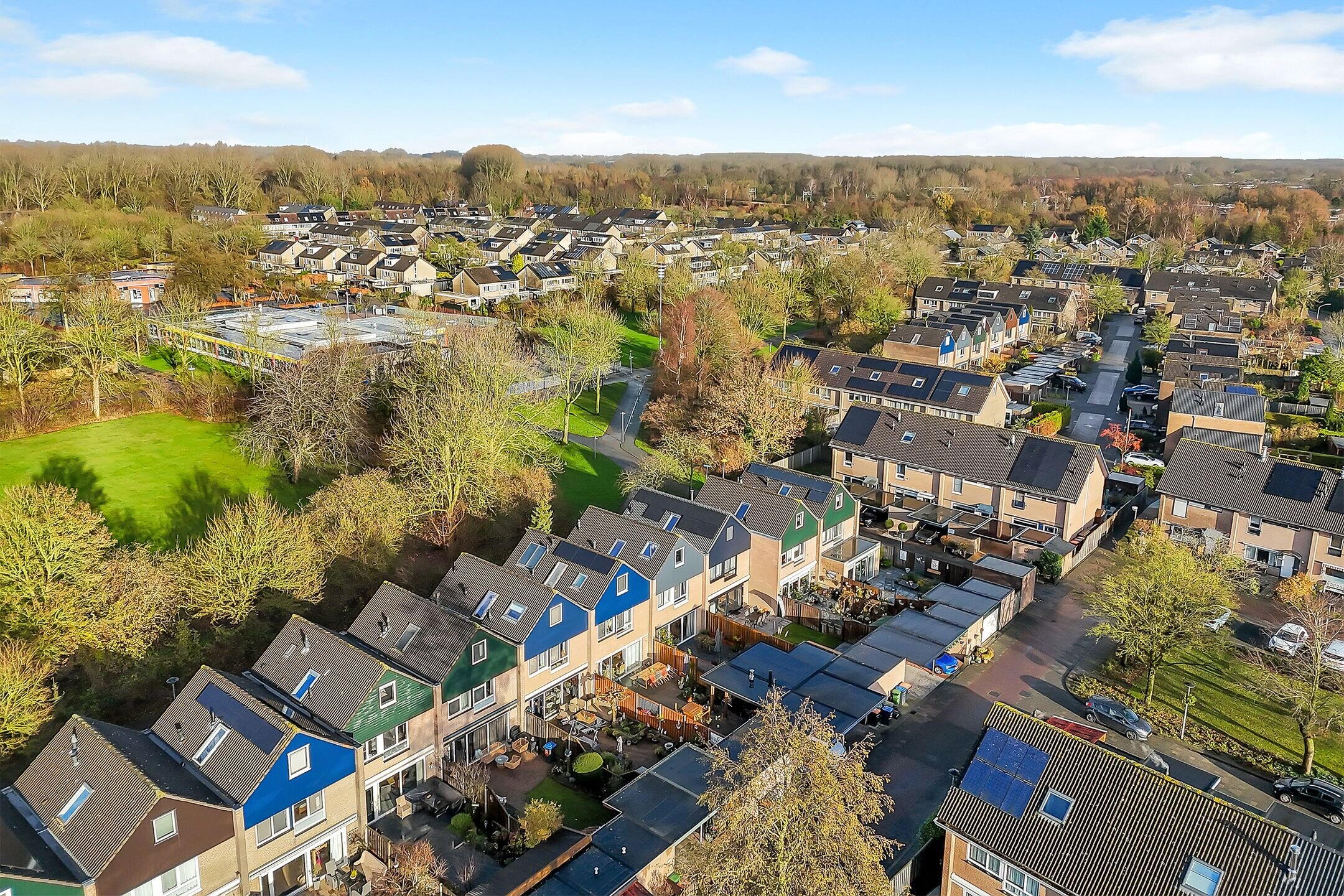 Voortuin grenzend aan fietspad en park. Entree, garderobe, meterkast (glasvezel aanwezig), toilet met hangcloset en fonteintje, open trap naar de eerste verdieping, doorgang naar de fraaie living welke aan de voorzijde van de woning is gesitueerd met uitzicht op groen en voorzien van een knusse, draaibare houtkachel. De moderne tuingerichte leefkeuken is voorzien van een kookeiland, Bora inductiekookplaat, koelkast, aparte vriezer, vaatwasser, Quooker kraan, combi-oven en veel lades en kastruimte. Middels 3 openslaande deuren bereikt u de op het zuiden gelegen tuin. De zeer nette tuin is voorzien van berging en achterom en biedt u volop privacy. Achter de tuin bevindt zich de carport waar u uw auto kunt parkeren.