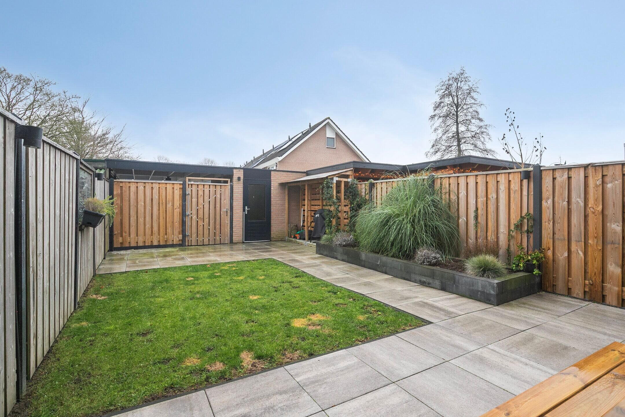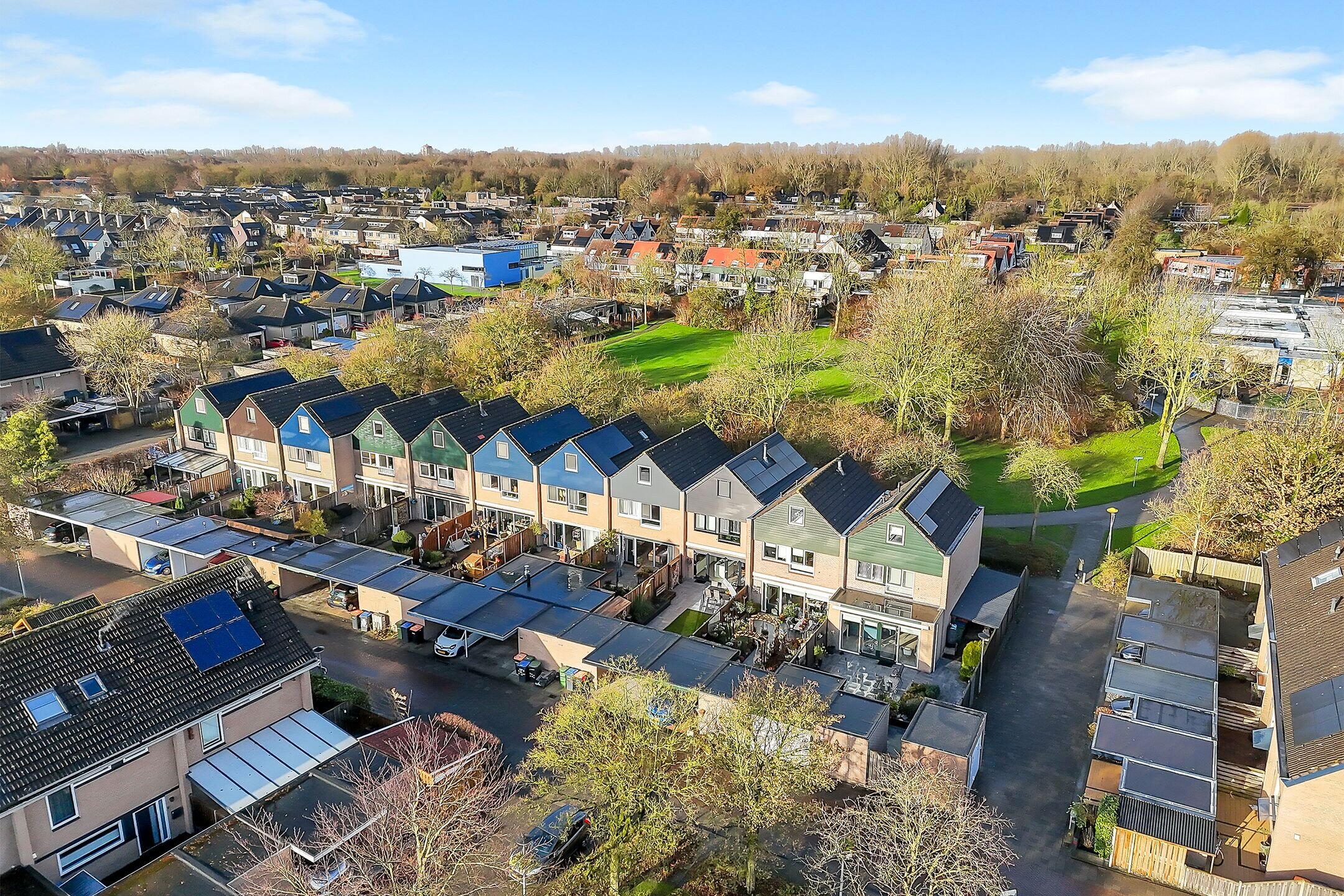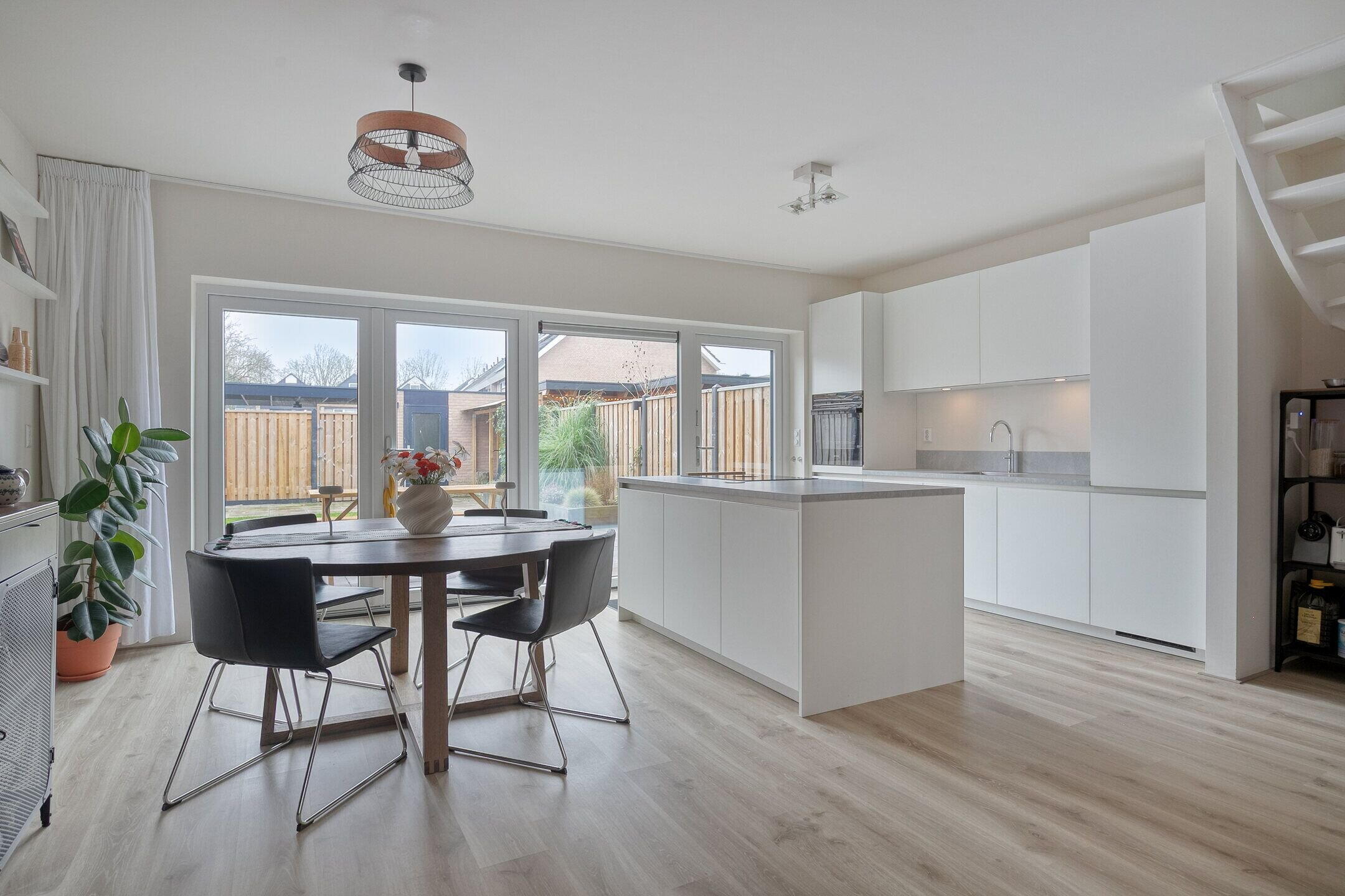 Voortuin grenzend aan fietspad en park. Entree, garderobe, meterkast (glasvezel aanwezig), toilet met hangcloset en fonteintje, open trap naar de eerste verdieping, doorgang naar de fraaie living welke aan de voorzijde van de woning is gesitueerd met uitzicht op groen en voorzien van een knusse, draaibare houtkachel. De moderne tuingerichte leefkeuken is voorzien van een kookeiland, Bora inductiekookplaat, koelkast, aparte vriezer, vaatwasser, Quooker kraan, combi-oven en veel lades en kastruimte. Middels 3 openslaande deuren bereikt u de op het zuiden gelegen tuin. De zeer nette tuin is voorzien van berging en achterom en biedt u volop privacy. Achter de tuin bevindt zich de carport waar u uw auto kunt parkeren.