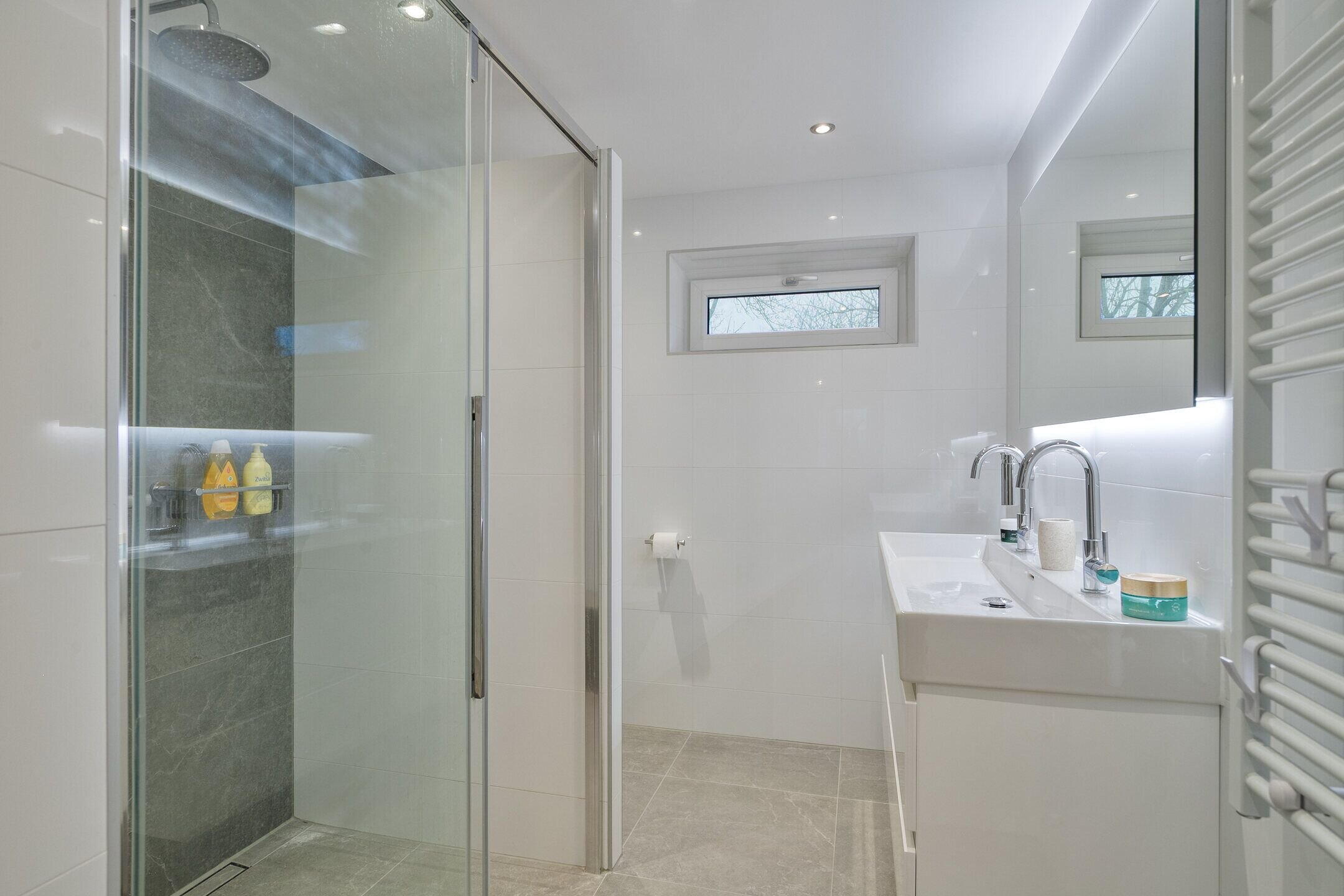 - Dubbele wastafel, inloopdouche, toilet, en wastafelmeubel